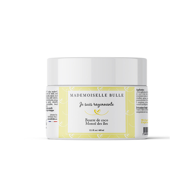 Un beurre de coco, d'origine biologique, parfumé au monoï. Ce beurre saura hydrater tout votre corps, jusqu'à la pointe de vos cheveux.